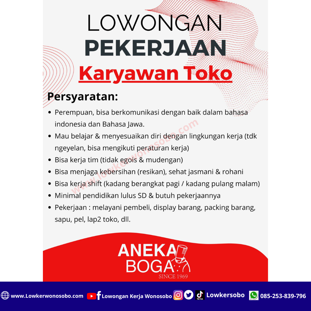 walk-in interview Senin (1 Desember 2025) jam 14.00 di Aneka Boga Heritage.
